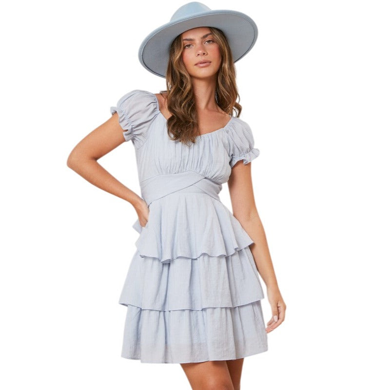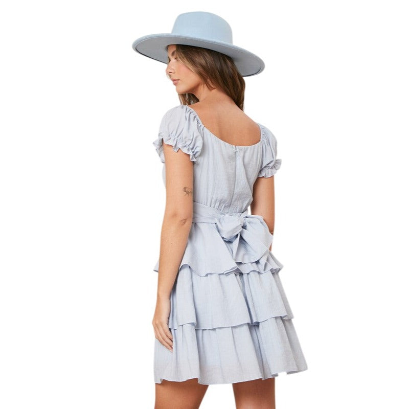 This stunning blue tiered dress from Peach Love California is designed to turn heads. The square neckline paired with delicate puff sleeves creates an instantly flattering frame, while the adjustable back tie ensures a custom fit just for you. Layered flounce tiers add dynamic movement and visual interest to every step. Whether you're dressing up for a special occasion or elevating your everyday style, this romantic piece delivers the sophistication and charm you deserve.