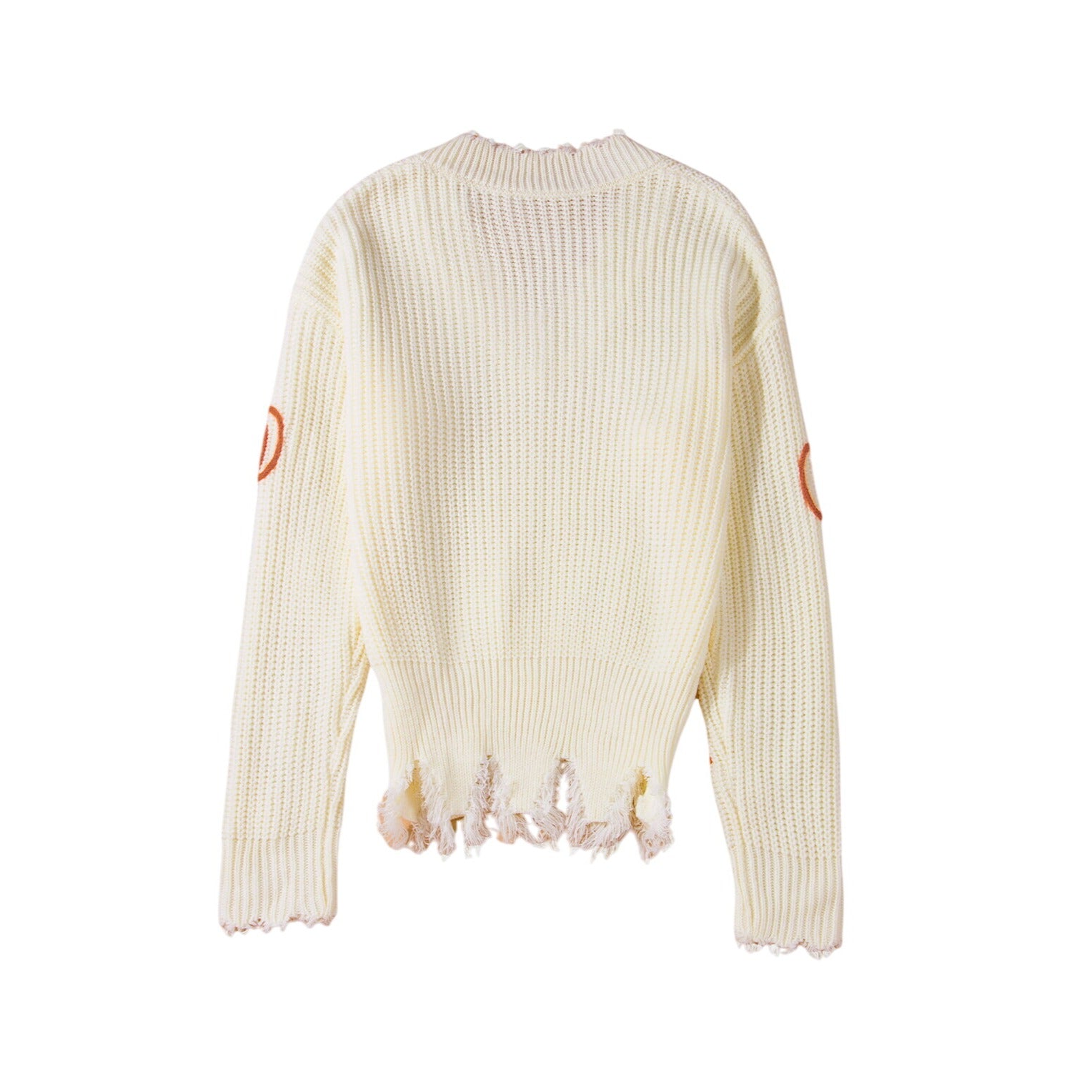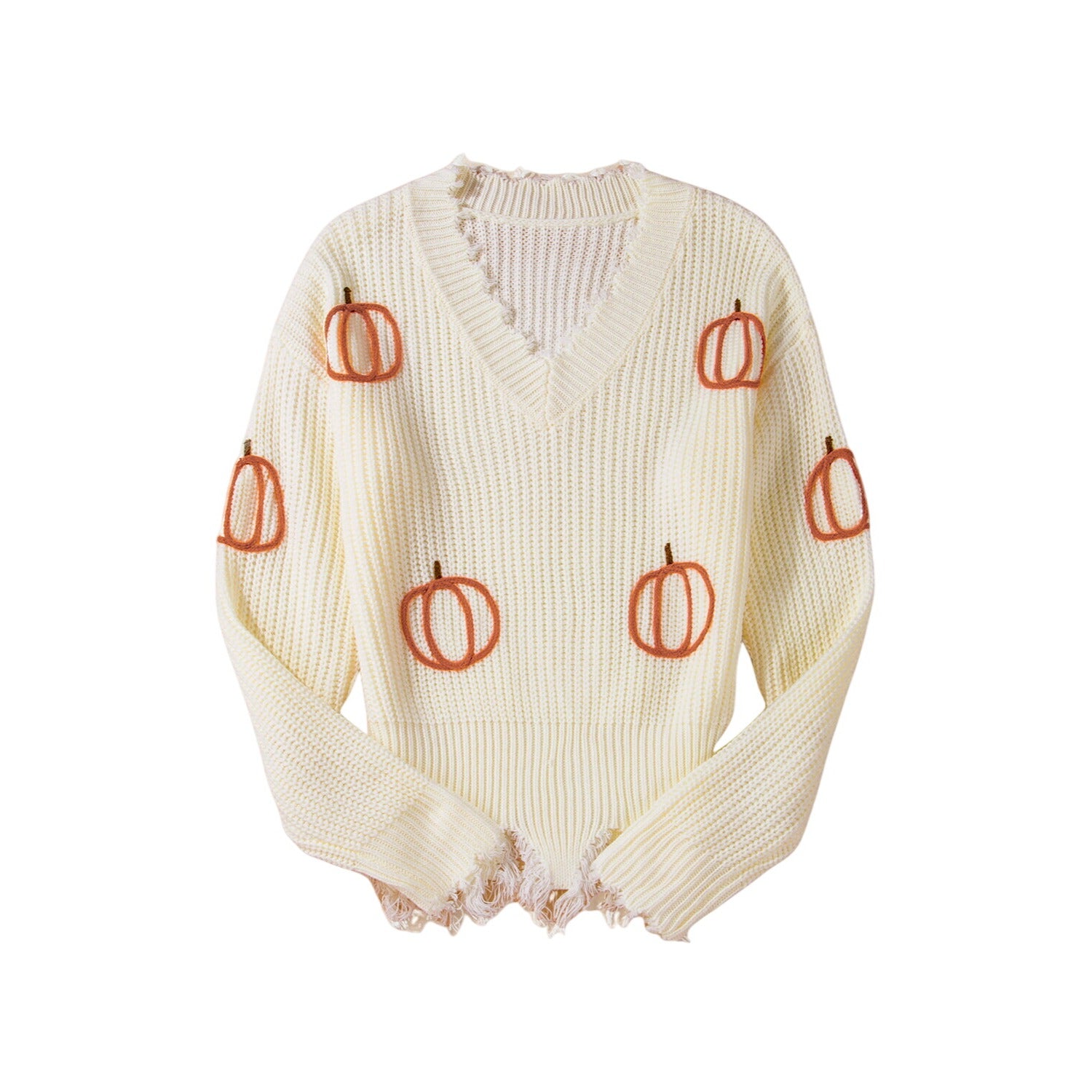 This beige sweater features a terracotta pumpkin yarn design with a cable knit pattern, a raw hem, and a flattering V-neck style. Perfect for adding cozy charm to your wardrobe.