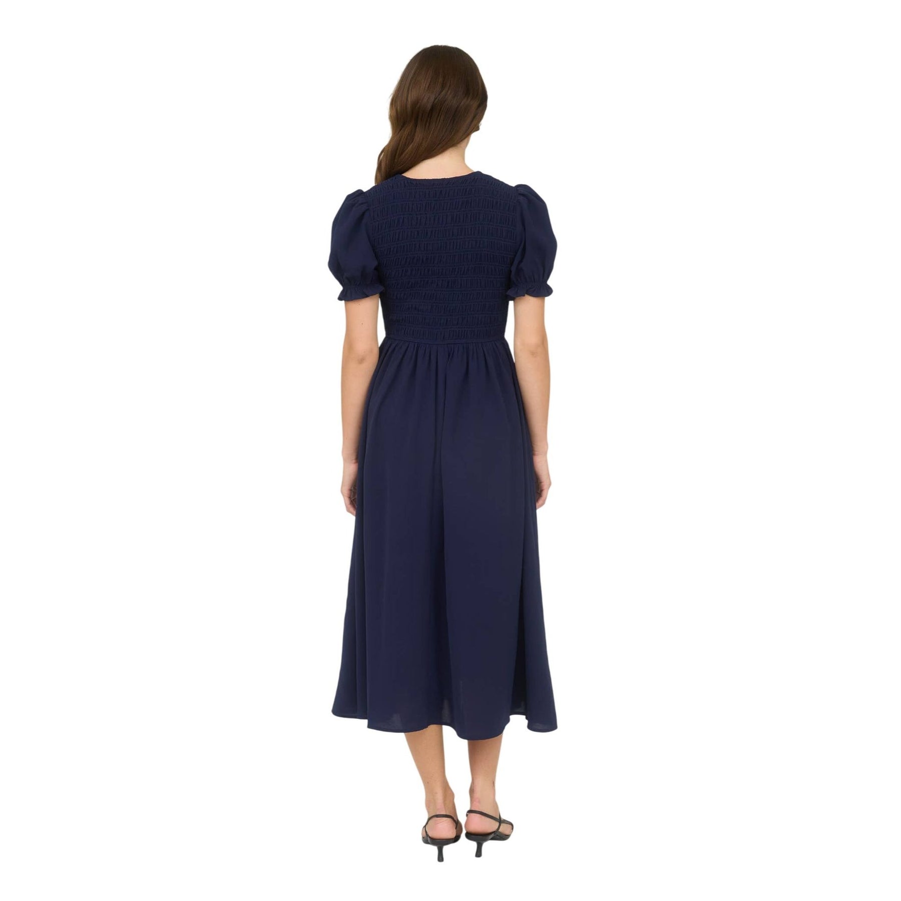 Blu Pepper V-Neck Front Tie Smocked Puff Sleeve Midi Dress CR2694