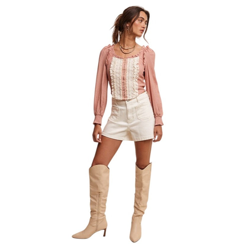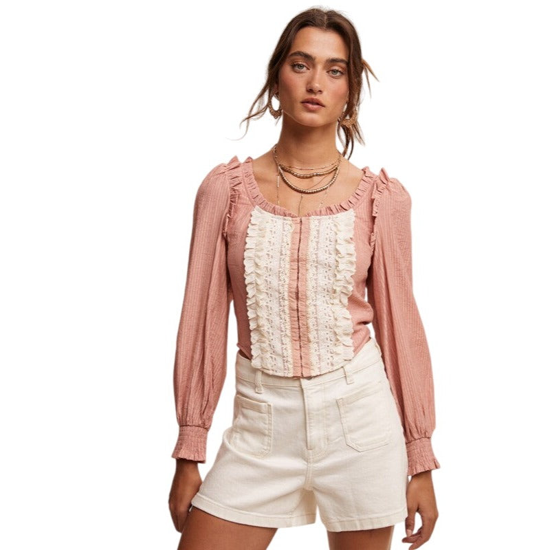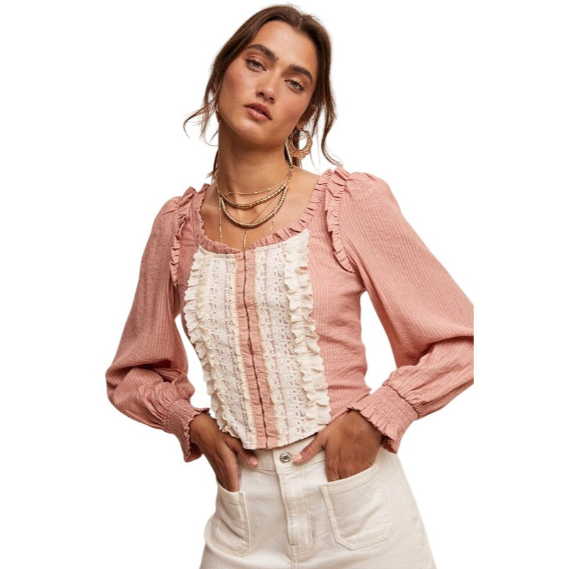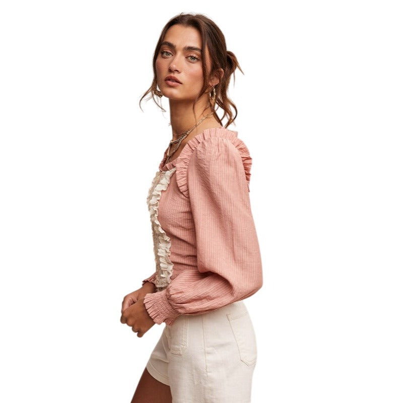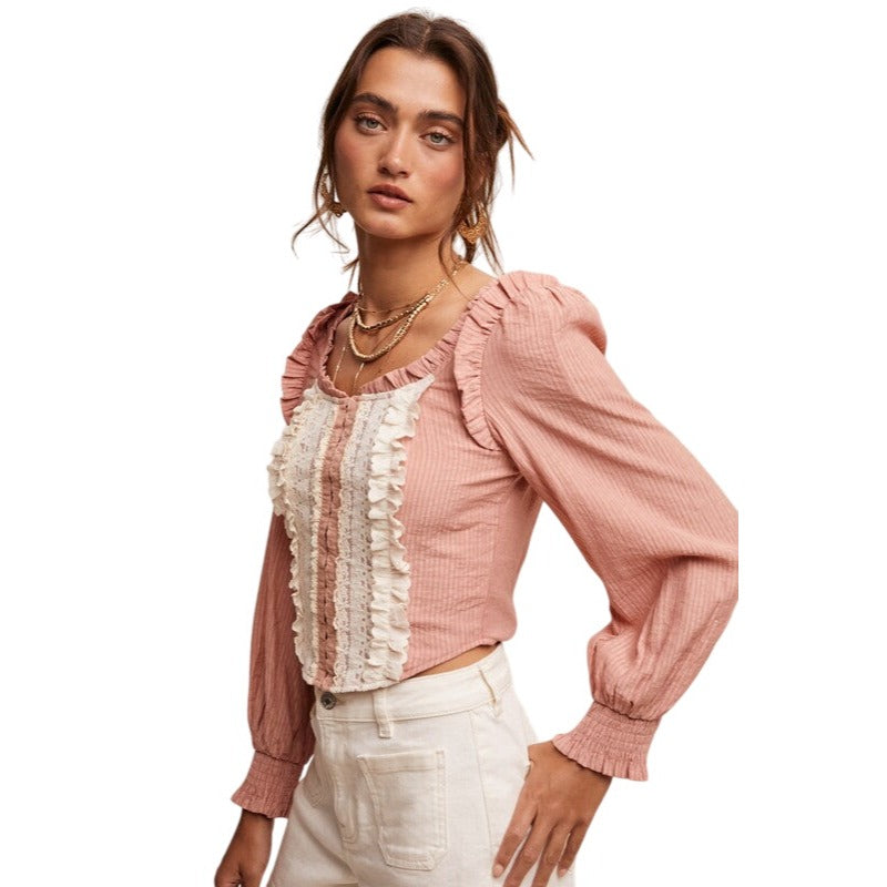 The Listicle Ruffled Smocked Long Sleeve Blush Pink Blouse LT1370 features a lightweight textured fabric that offers both vintage appeal and breathable comfort. Feminine ruffles adorn the neckline and front, while a delicate lace panel with vertical ruffle trim adds an elegant touch. The smocked back provides a comfortable, flexible fit, complemented by long puff sleeves with smocked cuffs for a flattering, voluminous look. Tailored at the waist, this blouse creates a chic silhouette perfect for brunches or romantic occasions. Pair it with high-waisted jeans or skirts to embrace timeless style.