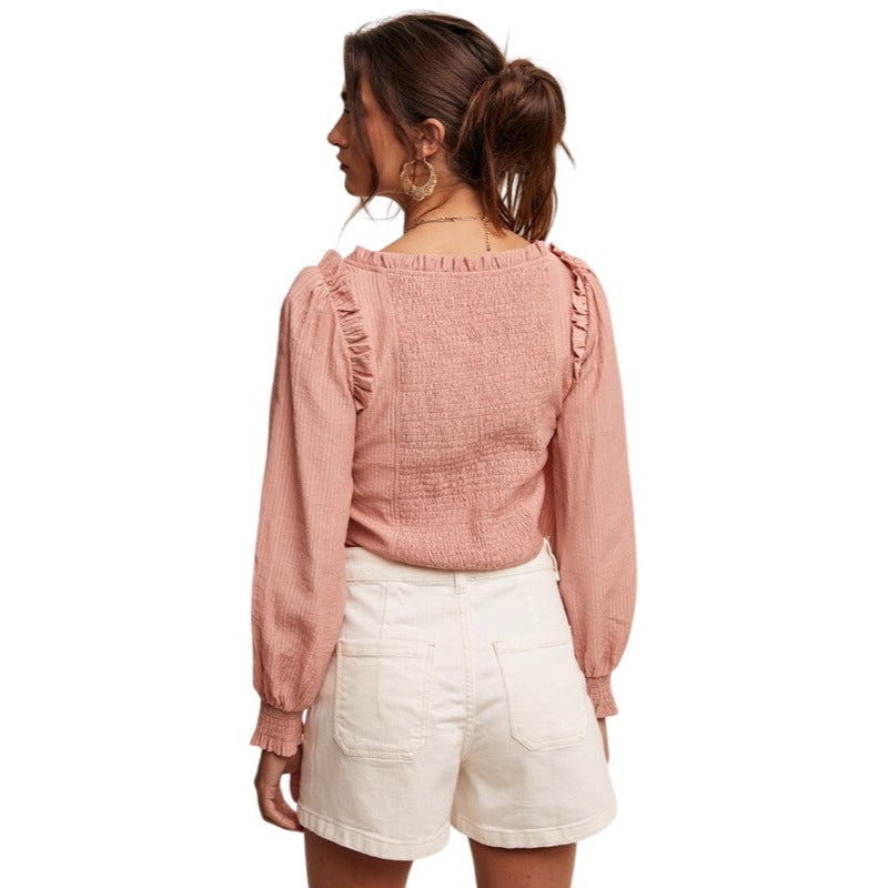 Listicle Ruffled Smocked Long Sleeve Blush Pink Blouse LT1370