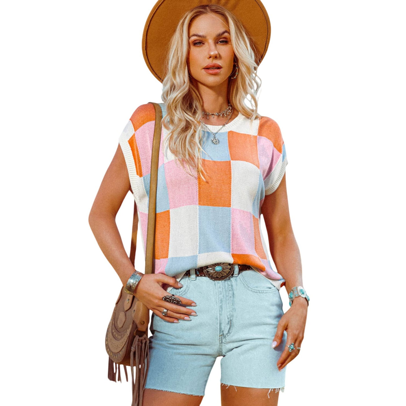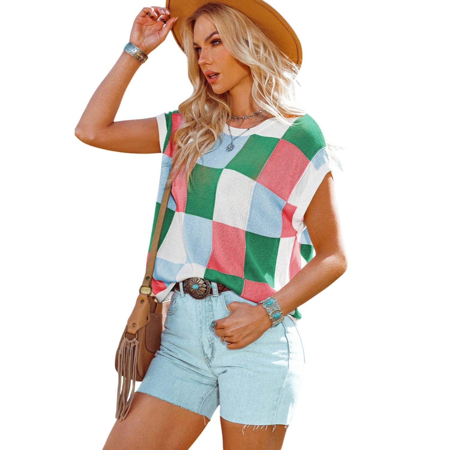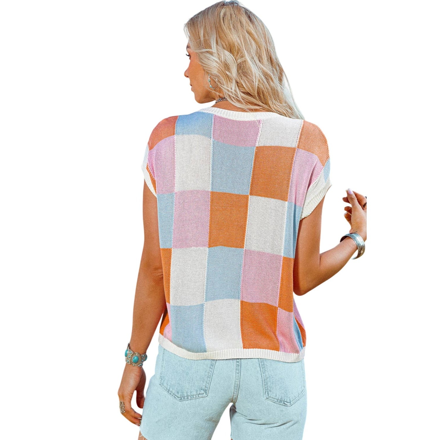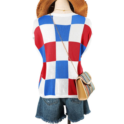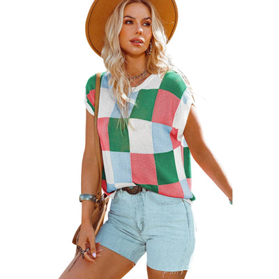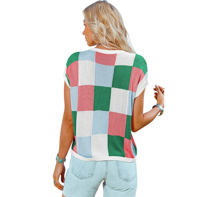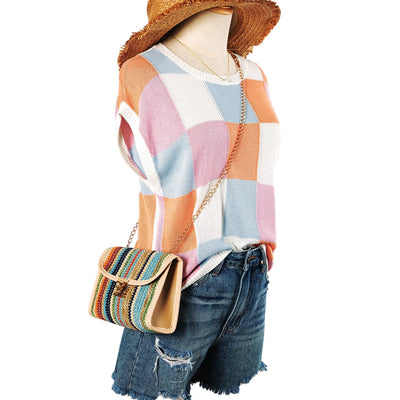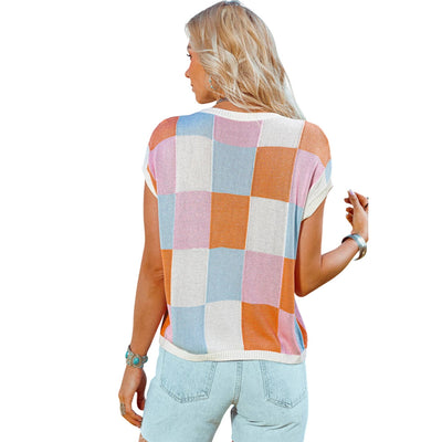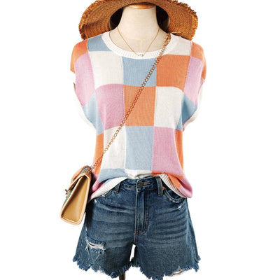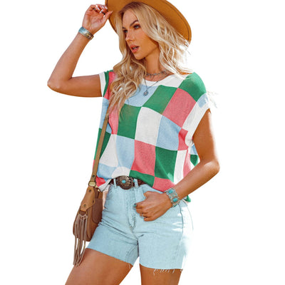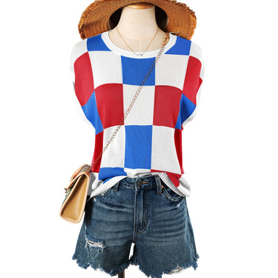 This lightweight knit top features a boxy fit, fashionable and relaxed The checkered print is perfect for going from edgy to dressy The cap sleeve style adds a romantic touch Style it up by pairing with jeans and be the talk of the town