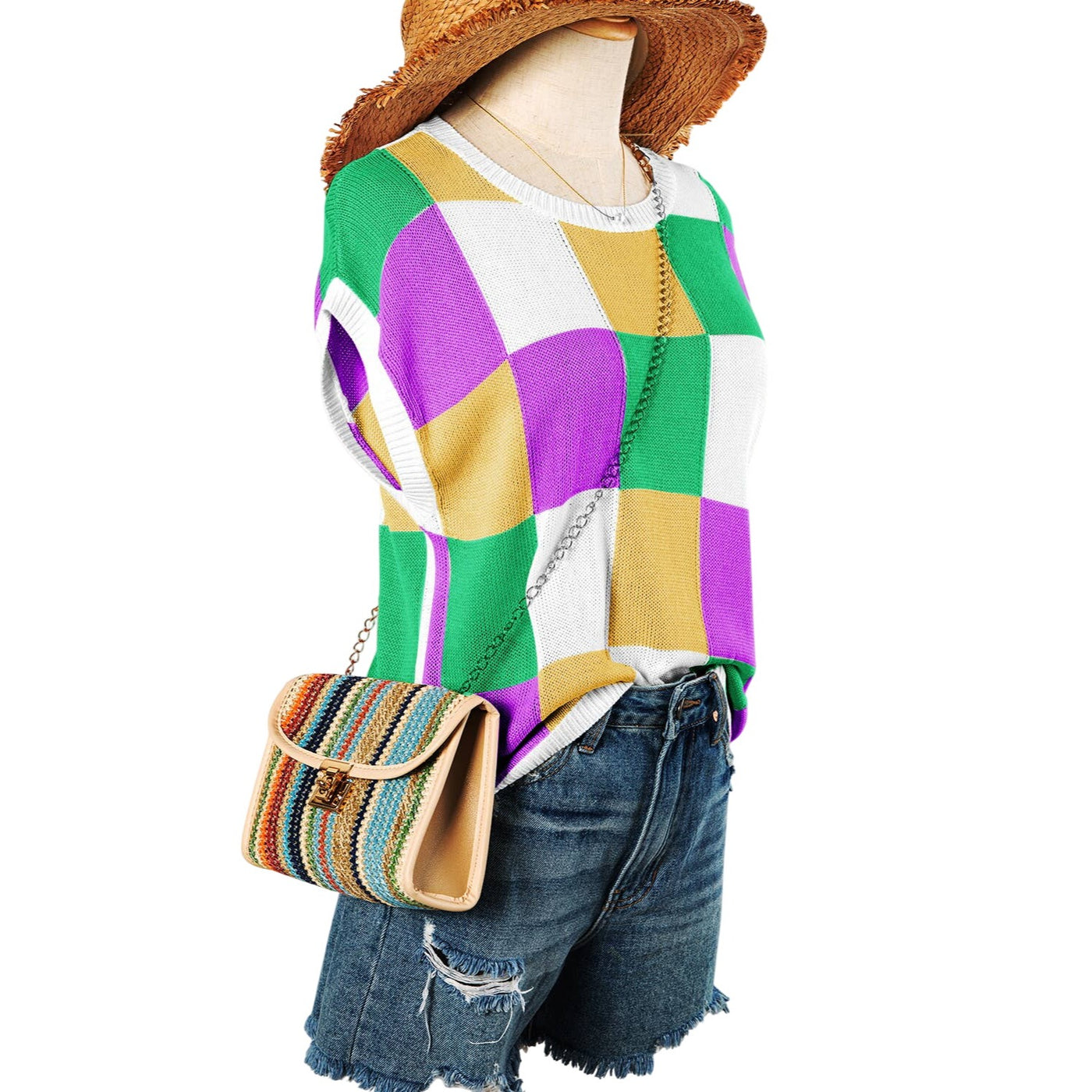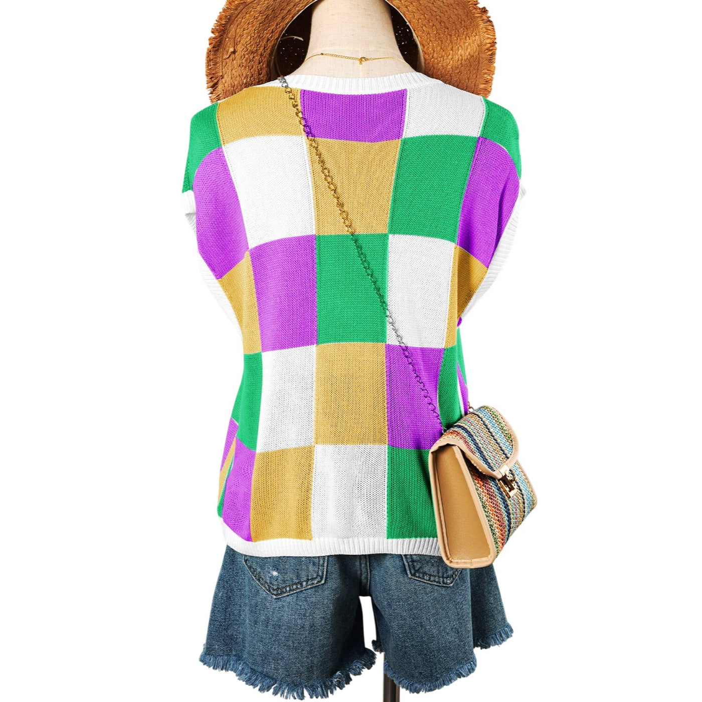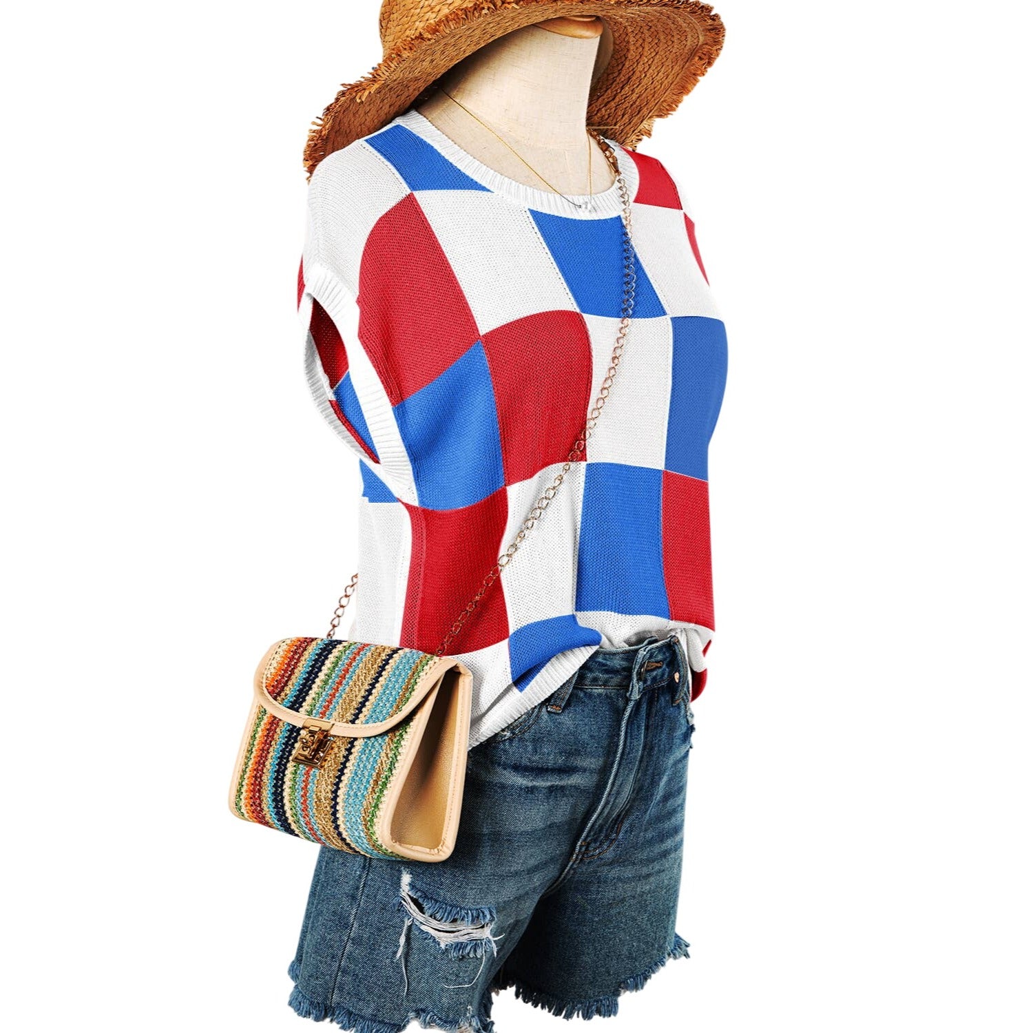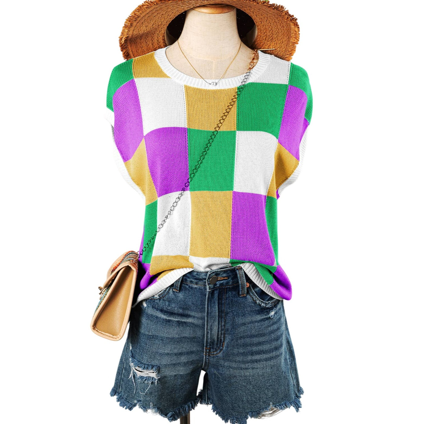 This lightweight knit top features a boxy fit, fashionable and relaxed The checkered print is perfect for going from edgy to dressy The cap sleeve style adds a romantic touch Style it up by pairing with jeans and be the talk of the town